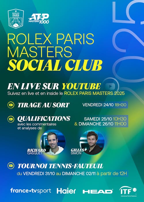 Cette année, vivez intensément les qualifications du simple messieurs et les épreuves de tennis-fauteuil en vous rendant sur la chaîne YouTube officielle du tournoi parisien. Rejoignez le Rolex Paris Masters Social Club et rendez-vous à Paris La Défense Arena dès le samedi 25 (le samedi et le dimanche, les entraînements sur le court central seront ouverts aux détenteurs de billets entre 12 et 17h) en prenant vos places sur le site de la billetterie officielle (à partir de 10€) !
